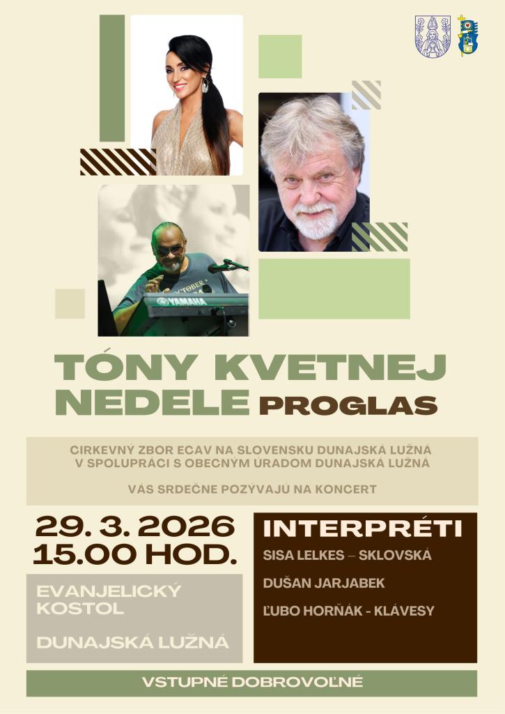 Hudobné popoludnie sa uskutoční v nedeľu 29. marca 2026 o 15.00 hod. v Evanjelickom kostole v Dunajskej Lužnej. Podujatie ponúkne jedinečný umelecký zážitok v podobe spojenia hudby, poézie a duchovnej atmosféry Kvetnej nedele.
