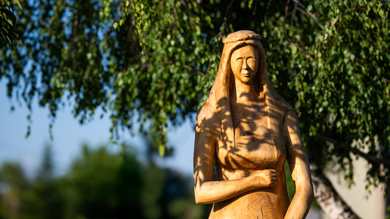 Priestor dotvárajú stĺpikové svietidlá a dve sochy od miestneho rezbára Juraja Mertuša.